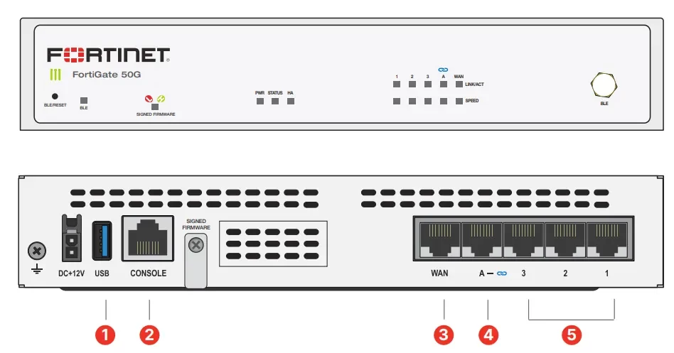 Fortinet FortiGate 50G دارای چندین پورت کاربردی است که اتصال به شبکههای داخلی، خارجی و تجهیزات مدیریتی را فراهم میکند. شرح هر پورت به صورت شمارهبندی شده: